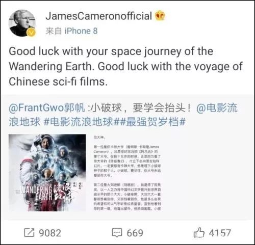《流浪地球》到底有多好看?据统计,《流浪地球》首日票房1.87亿。2月5日,导演郭帆发长文《小破球,要学会抬头!》,回顾了电影从筹备到上映的四年半时间里的点点滴滴。随后,著名导演卡梅隆转发并表示祝贺: