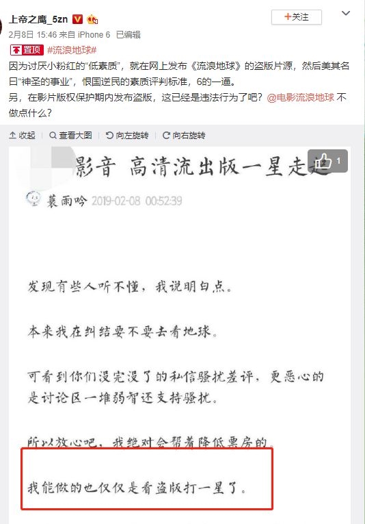 甚至有人在网络上号召说,只看盗版,并且还要打一星!