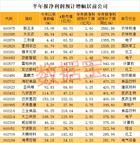 72股上半年净利润预计增幅在50%以上,新五丰、大北农、三利谱、星网宇达、雅本化学等股净利润预计增幅在10倍以上。