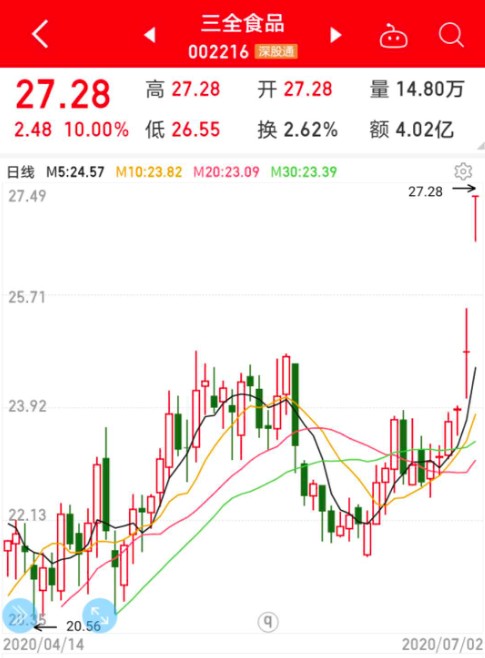 业绩暴增公司显然更受投资者青睐,近几日不少公司在业绩预告披露后股价大涨。7月1日晚间,三全食品发布业绩预告,由于改善渠道质量,聚焦核心场景,加大产品创新,同时得到子公司股权转让的相关收益、政府疫情期间为支持企业复产复工发放的稳岗补贴等补助资金,公司预计上半年净利润为4.35亿元至4.62亿元,同比增长390%至420%。在消息公布后的次日,三全食品开盘后迅速被封上涨停板,最新收盘价已创历史新高。